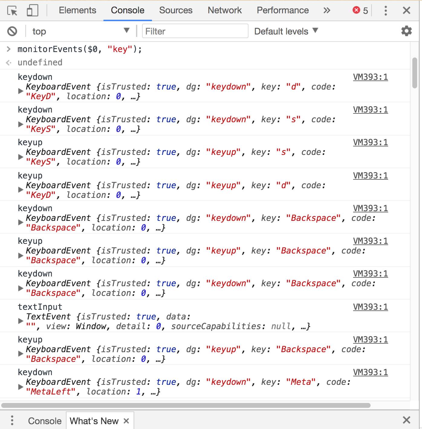 此时在网页搜索框内随便打些内容,再一一删除。你会看到 Console 随着你的键盘动作疯狂地跳出很多反馈信息。