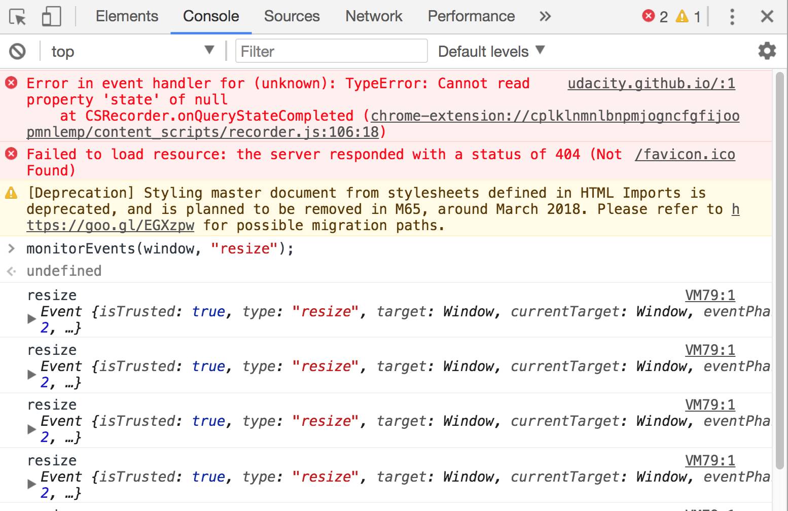 若无意外,此时 Console 内会跳出大量反馈信息——因为我们输入的指令就是在监视窗口的大小改变么。细看一下反馈信息,确实都是以 resize ▶︎Event {isTrusted: true, type: "resize", target: Window, ... 为开头的信息;凭借这些详细数据,工程师就足以判断用户端进行了什么相关操作。